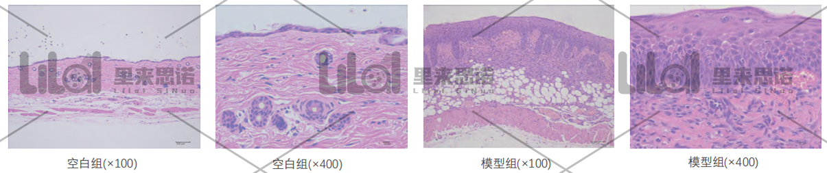 模型組:皮膚表皮層明顯增厚,可見棘層細胞、基底層細胞層數增多,細胞體積增大;真皮層組織膠原纖維結構溶解、壞死,胞核固縮或消失,伴有炎性