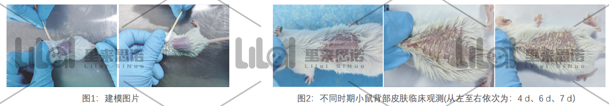 建模方法:剃除小鼠背部2cmx2cm大小區域的毛發,使用棉簽蘸取藥膏均勻涂抹在小鼠裸露的背部,每天涂抹1次,連續涂抹7 d(如圖1所示)。