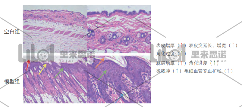 模型組皮膚組織結構受損,部分表皮輕微壞死,表皮增厚較為明顯,棘層細胞層數明顯增 多,局部表皮突延長、增寬,伸入真皮內,局部區域乳突上頂;表皮淺層角化過度、不全; 真皮膠原極少量中性粒細胞浸潤,局部毛細血管輕微充血擴張。