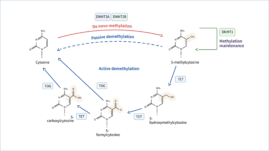 DNA甲基化通常抑制基因表達,去甲基化則誘導了基因的重新活化和表達。這種DNA修飾方式在不改變基因序列前提下實現對基因表達的調控。
